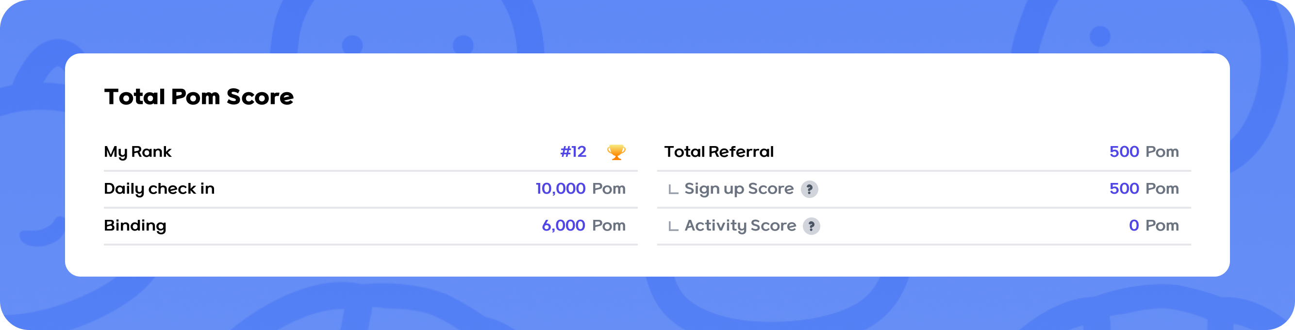 In Total POM Score section, you can see the total amount of POM(points) you earned through various content in Pomeworld platform.