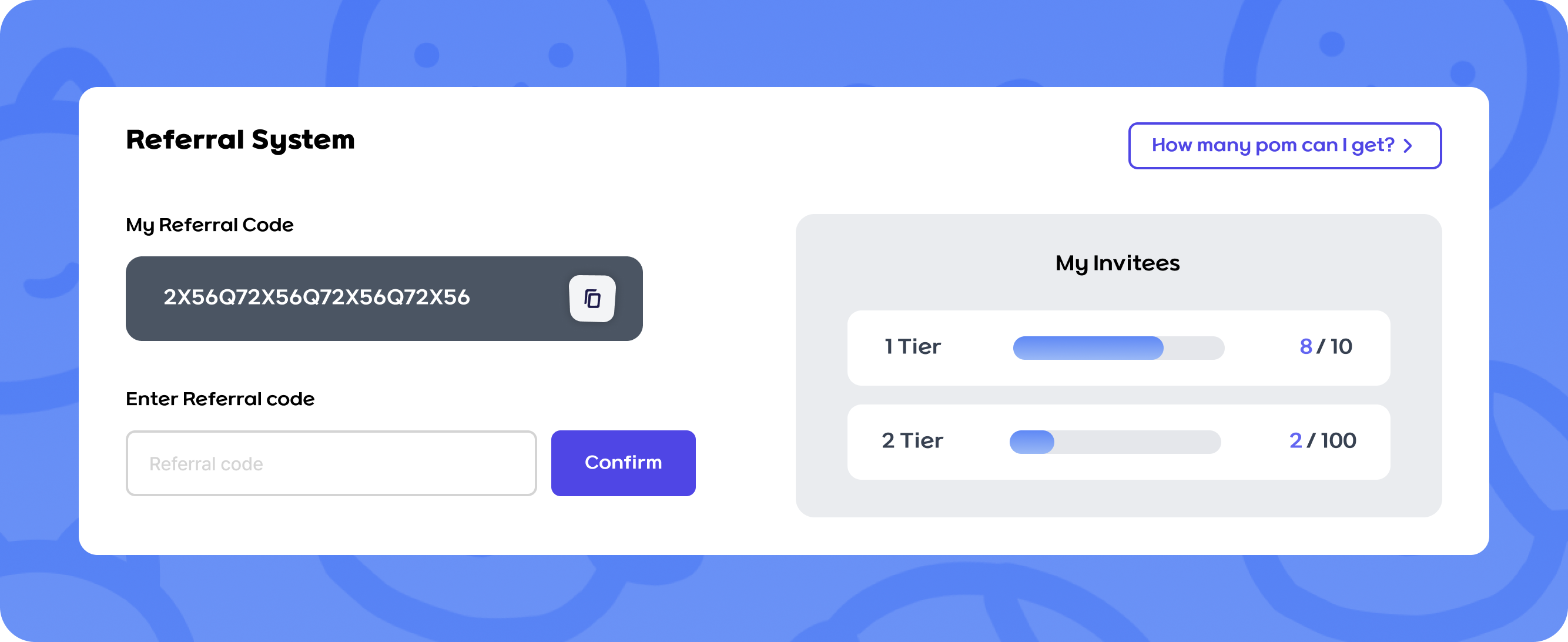 In the Referral System section, you can check out your referral code and the rewards for participating in the referral program. These bonuses are incentives for inviting friends and help you earn rewards faster.
